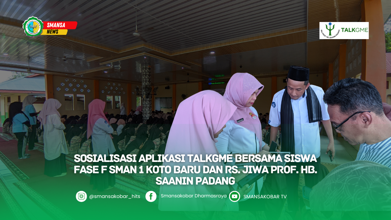 SMAN 1 Koto Baru kembali menunjukkan komitmennya dalam mendukung kesehatan mental remaja dengan menggelar kegiatan sosialisasi aplikasi Talkgme. Kegiatan ini dilaksanakan bekerja sama dengan Rumah Sakit Jiwa Prof. HB. Saanin Padang dan diikuti oleh seluruh siswa Fase F (kelas XI).